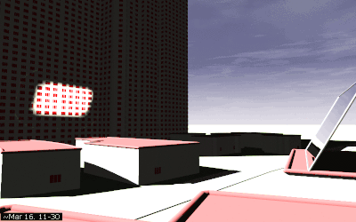 The sun-study functionality (mostly used for shadow studies) can now also be used in the context of glare studies. For example, it can be used when evaluating photovoltaic panels, which, in this version, can be modelled using mirrors (3d-poly elements with material/texture "mirror"/"Spiegel"); see Fig. 1.