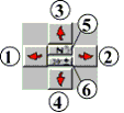 1, 2: Déplacement de la vue parallèle à la direction du regard (dans un plan X/Y fixe): Les positions de la caméra et de la cible sont décalées parallèlement vers la gauche ou la droite en quantités égales.