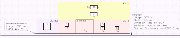 Die Plandarstellung ist durch ein Gitternetz (10 m x 10 m) strukturiert. Sämtliche Objekte, mit Ausnahme der Strasse, befinden sich auf einer Gitternetzlinie. Die Strassenachse weist einen Abstand von 5 m zur geplanten Lärmschutzwand auf. Für die Gebäude und die Parzelle wurden folgende Annahmen getroffen: