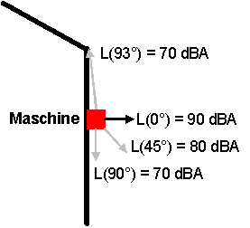Zu einer Maschine vor einer reflektierenden Wand gibt es keine Angaben zur Schallleistung und Direktivität. Mit Messungen vor Ort wird der gerichtete Schalldruckpegel rund um die Maschine gemessen und auf die Distanz von 1m Abstand umgerechnet. Die Maschine befindet sich vor der senkrechten Gebäudemauer auf ca. 10 m Höhe.