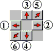 5, 6: Verschieben des Bildausschnittes in Blickrichtung (in der X/Y-Ebene): Kamerastandort und Zielpunkt werden parallel zur aktuellen Blickrichtung in Blickrichtung/entgegen der Blickrichtung verschoben. In Z-Richtung erfolgt keine Veränderung, d.h. die Höhe des Kamerastandortes und des Zielpunktes bleiben konstant.