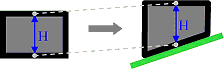 - obere Elementform relativ beibehalten, H neu ≥ H alt: Die Form der Objektoberkante bleibt erhalten (z.B. Höhendifferenzen eines Schrägdaches), das Element wird so an das Terrain angepasst, dass die neuen Höhen H bei allen Punkten des Elementes mindestens gleich gross oder grösser als die ursprünglichen Höhen H sind.