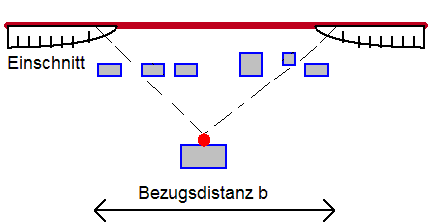 Die Auswirkung des Abstands in der (orthogonalen) Distanz s wird nach der Verdoppelungs-Gesetzmässigkeit für Linienquellen (0 bei 1m Abstand und +3dBA pro Distanzverdoppelung) ermittelt: